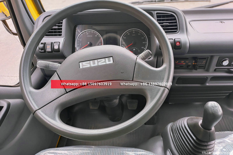 ISUZU ELF 100P Brand new driver's cabin The large curvature rearview mirror provides a wide field of view. The front window glass and side window A-pillar blind spot are only 7 °. It adopts sedan style seats, soft steering wheel, refreshing and comfortable, and the driver will not feel tired during long-distance driving |